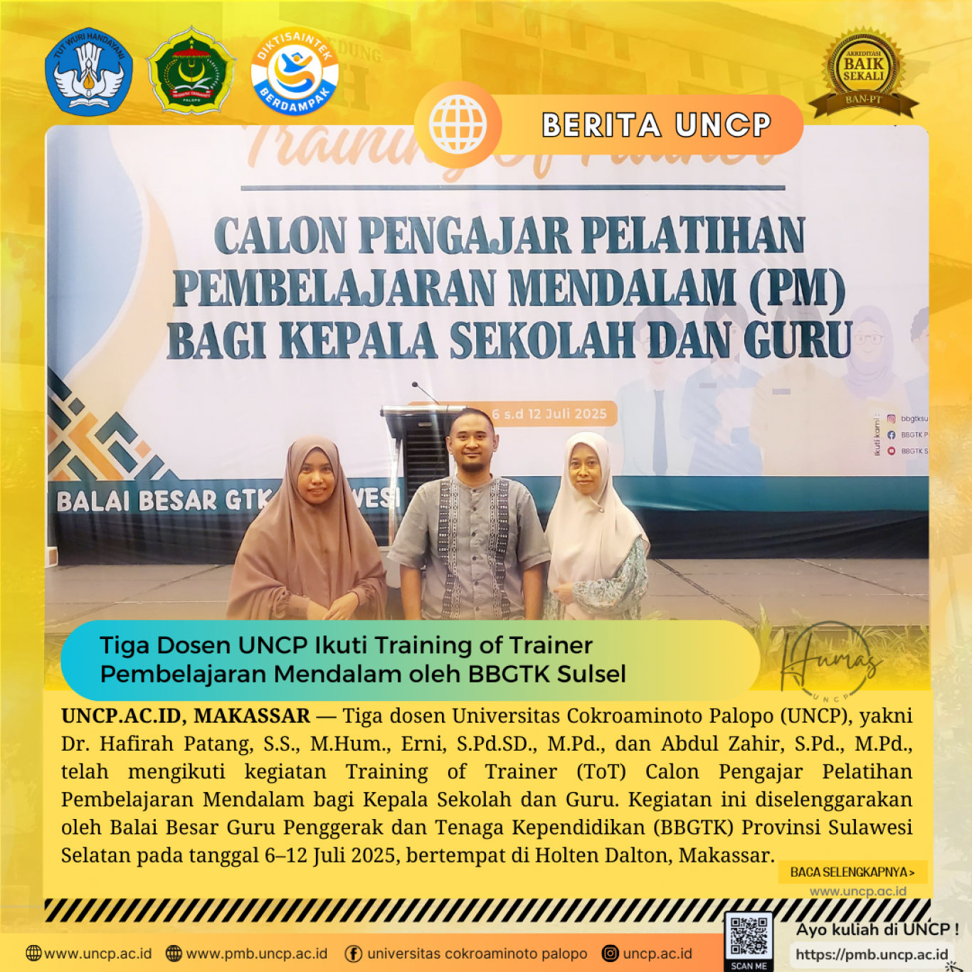 UNCP.AC.ID Makassar – Tiga dosen Universitas Cokroaminoto Palopo (UNCP), yakni Dr. Hafirah Patang, S.S., M.Hum., Erni, S.Pd.SD., M.Pd., dan Abdul…