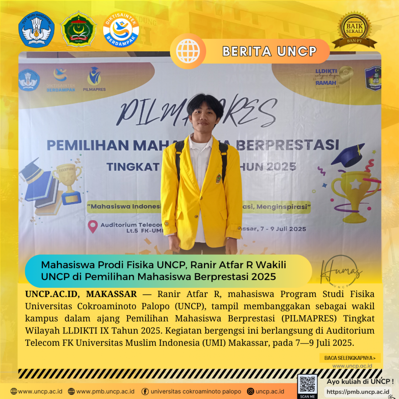 UNCP.AC.ID Makassar – Ranir Atfar R, mahasiswa Program Studi Fisika, Fakultas Sains Universitas Cokroaminoto Palopo (UNCP), tampil membanggakan sebagai wakil…