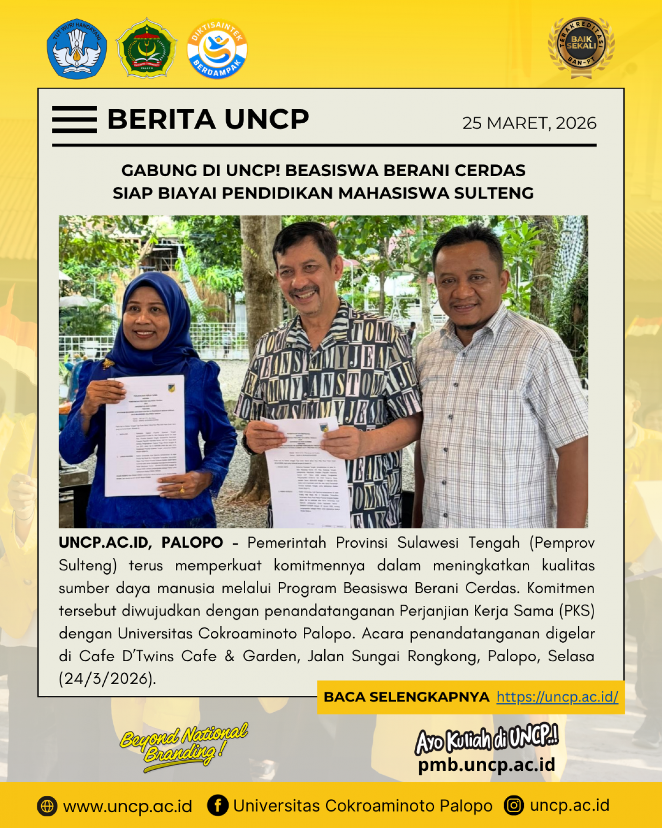 Gabung di UNCP! Beasiswa Berani Cerdas Siap Biayai Pendidikan Mahasiswa SULTENG
