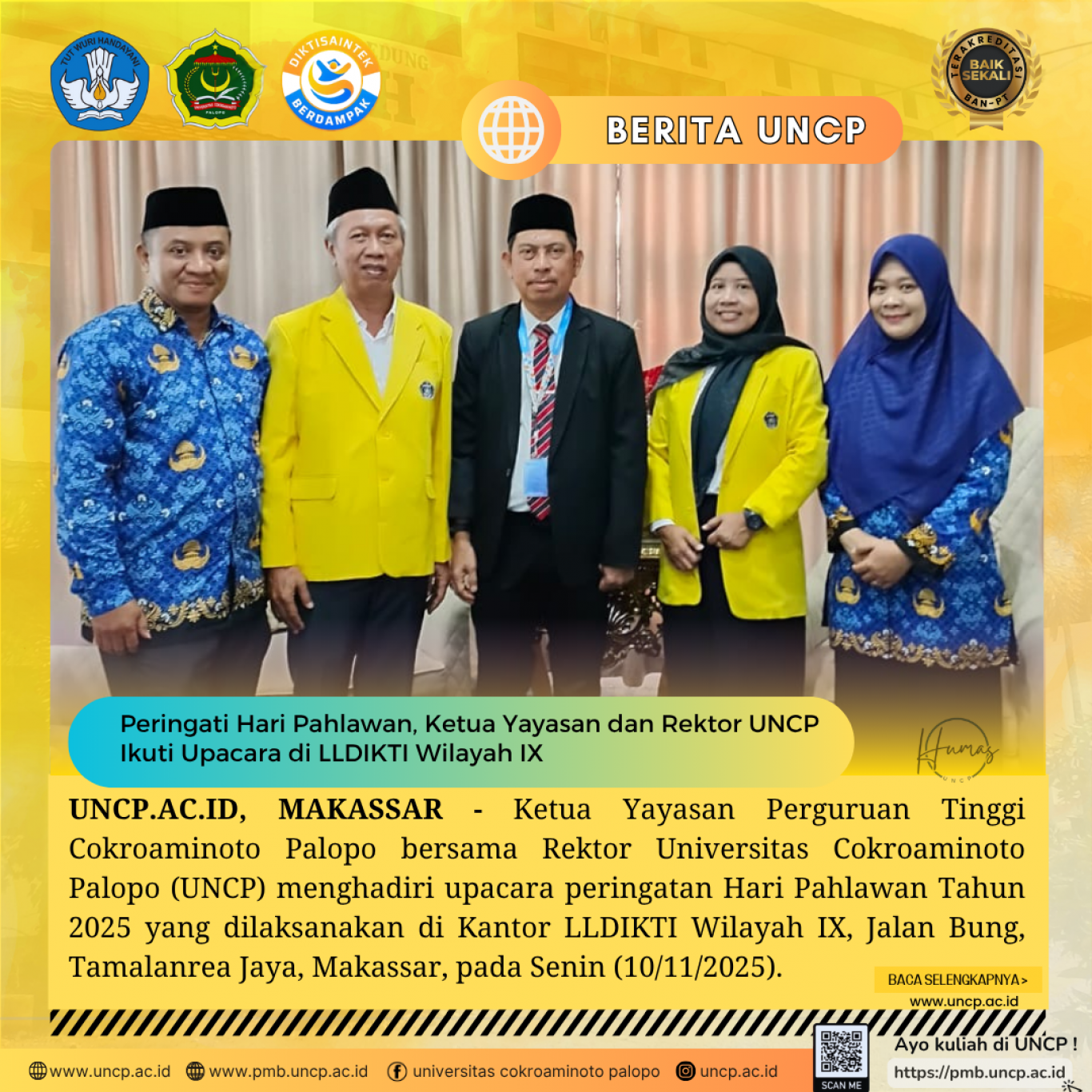 UNCP.AC.ID, MAKASSAR - Ketua Yayasan Perguruan Tinggi Cokroaminoto Palopo bersama Rektor Universitas Cokroaminoto Palopo (UNCP) menghadiri upacara peringatan Hari Pahlawan Tahun…