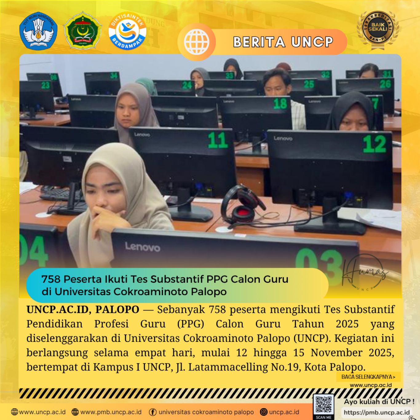 UNCP.AC.ID, PALOPO - Sebanyak 758 peserta mengikuti Tes Substantif Pendidikan Profesi Guru (PPG) Calon Guru Tahun 2025 yang diselenggarakan di Universitas…