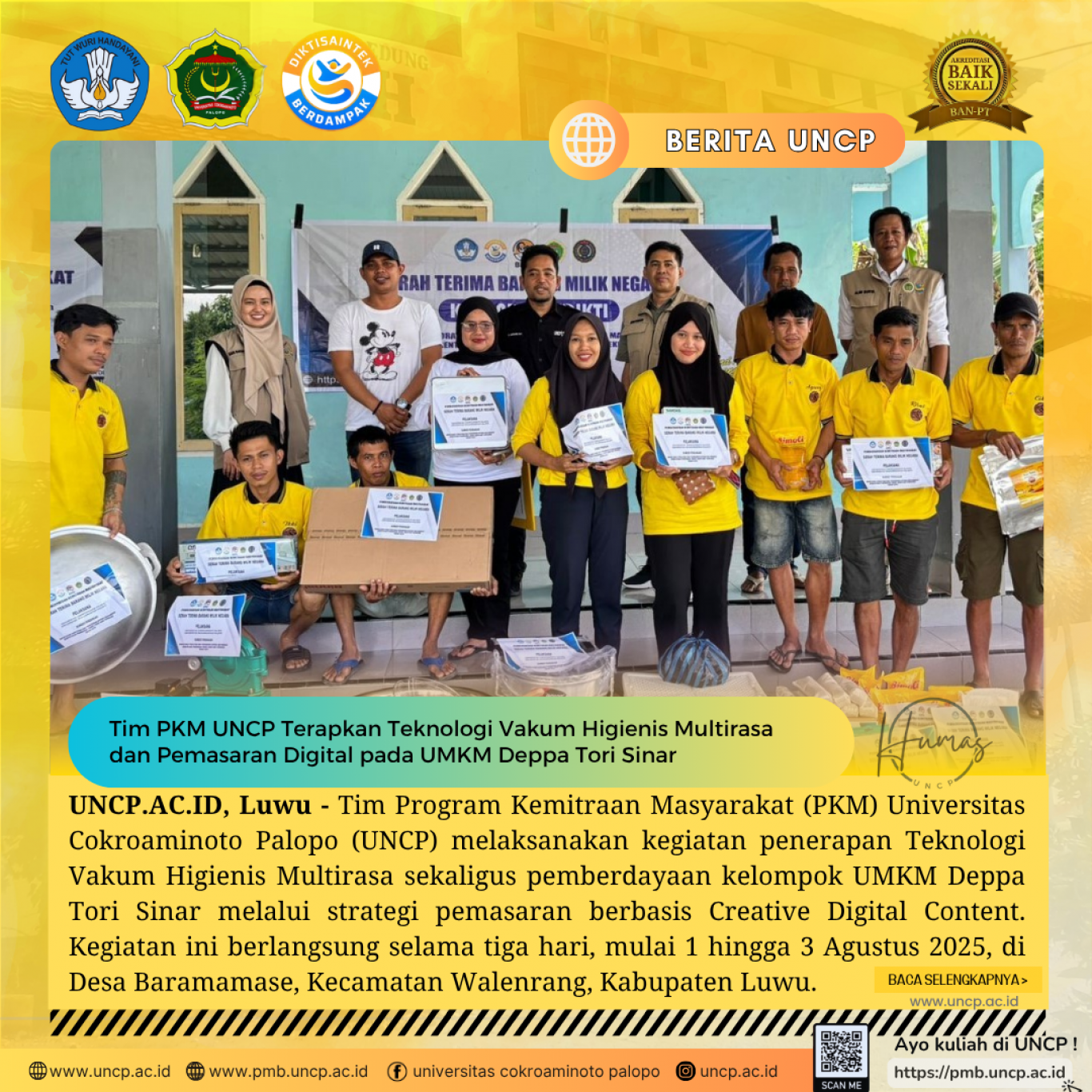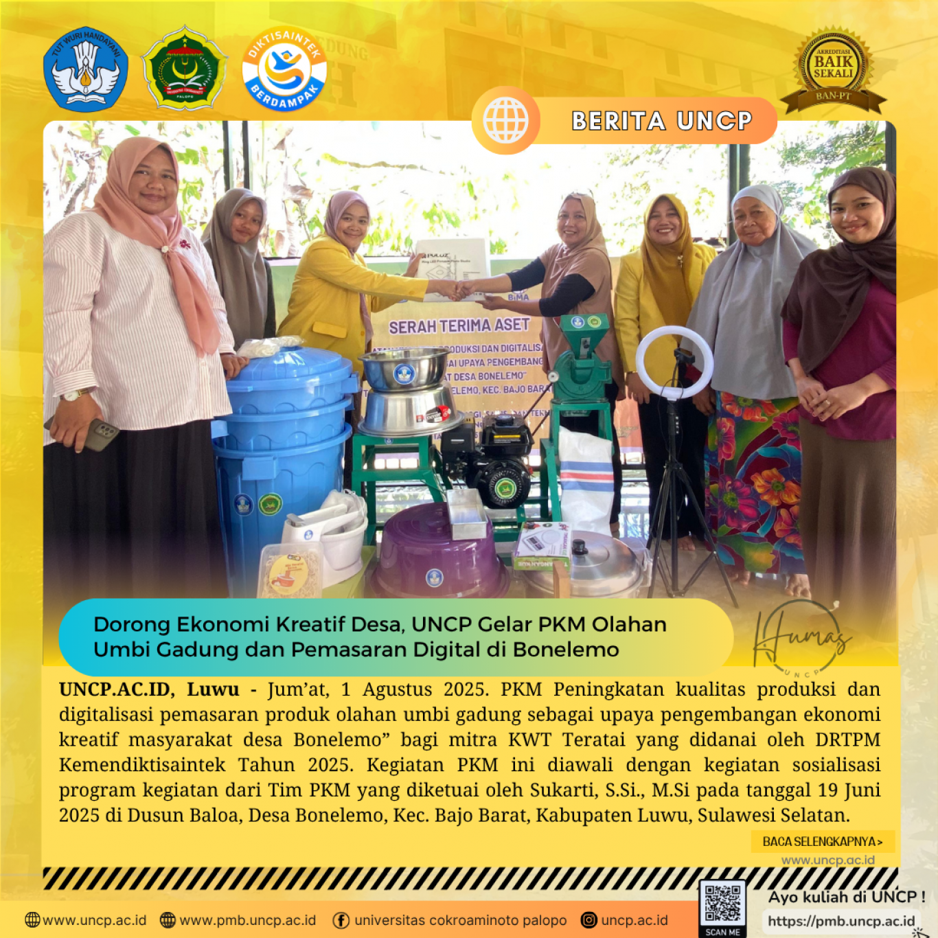 UNCP.AC.ID, Luwu - Jum’at, 1 Agustus 2025. PKM Peningkatan kualitas produksi dan digitalisasi pemasaran produk olahan umbi gadung sebagai upaya pengembangan…