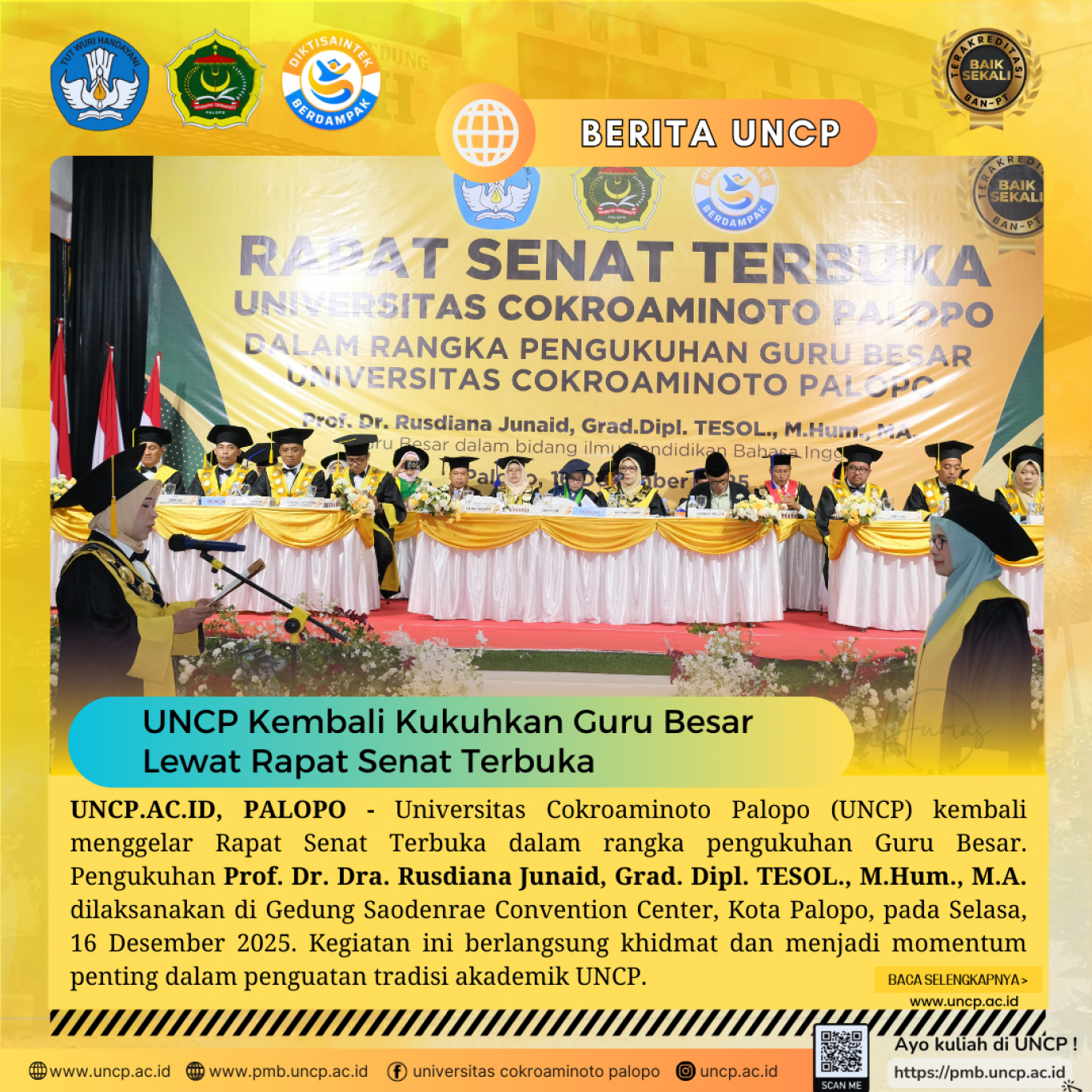 UNCP.AC.ID, PALOPO - Universitas Cokroaminoto Palopo (UNCP) kembali menggelar Rapat Senat Terbuka dalam rangka pengukuhan Guru Besar. Pengukuhan Prof. Dr. Dra. Rusdiana…