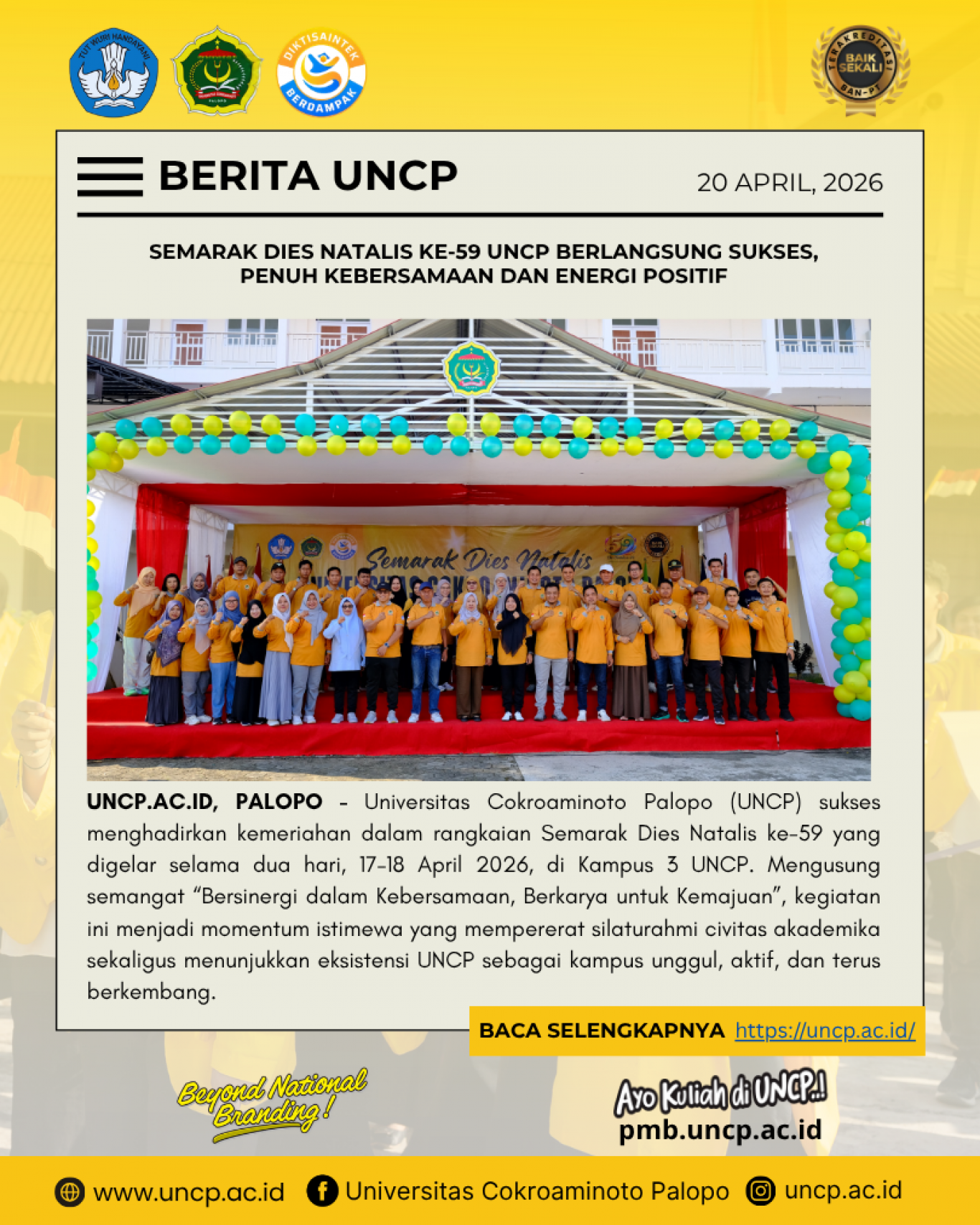 UNCP.AC.ID, PALOPO - Universitas Cokroaminoto Palopo (UNCP) sukses menghadirkan kemeriahan dalam rangkaian Semarak Dies Natalis ke-59 yang digelar selama dua hari, 17–18 April 2026, di Kampus 3 UNCP. Mengusung semangat “Bersinergi dalam Kebersamaan, Berkarya untuk Kemajuan”, kegiatan ini menjadi momentum istimewa yang mempererat silaturahmi civitas akademika sekaligus menunjukkan eksistensi UNCP sebagai kampus unggul, aktif, dan terus berkembang.